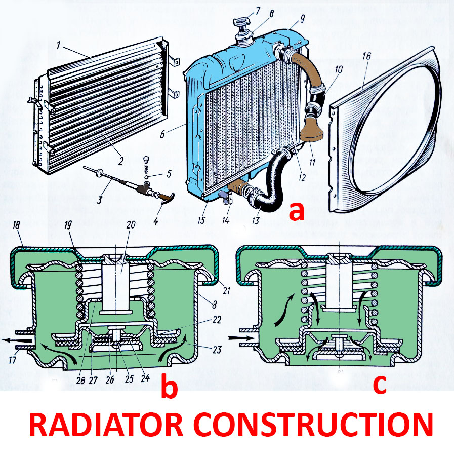 - parts of radiator; b – steam exhaust valve open; c – air inlet valve open; 1- housing; 2 – radiator gills; 3 – draught; 4 – handle; 5 – fixator; 6 – stand; 7 – radiator filler cap; 8 – radiator filler neck; 9 – upper radiator tank; 10 and 13 – flexible hoses; 14 – radiator drain cock; 15 – lower radiator tank; 16 – quide cover; 17 – steam pipe; 18 – radiator filler cap housing; 19 – spring of steam valve; 20 – stand; 21 – lock spring; 22 – steam valve; 23 – steam valve rubber gasket; 24 – air valve rubber gasket; 25 – air valve; 26 – spring of air valve; 27 – air valve seat; 28 – air inlet.