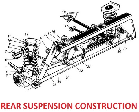 The guiding device is two upper, two lower and transverse rods (rods) installed between the bridge and the body and fixed in rubber-metal hinges. Longitudinal rods, working together, perceive longitudinal forces. The cross bar only balances the lateral forces. The upper rods are shorter than the lower ones, and the lengths of the rods and their ratio are selected in such a way as to ensure stable operation of the rear universal joint and spline connection of the universal joint shaft.